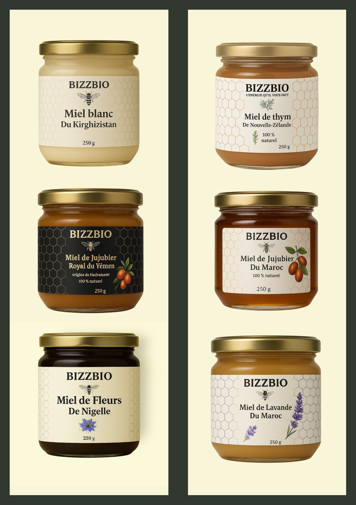 Les miels BIZZBIO, issus de terroirs d’exception comme le Kirghizistan et le Maroc, sont de véritables trésors naturels. Le miel blanc du Kirghizistan, rare et crémeux, est reconnu pour ses propriétés antibactériennes, apaisantes et son action bénéfique sur la digestion. Le miel de lavande du Maroc, aux arômes floraux délicats, est apprécié pour ses effets calmants, ses vertus antiseptiques et son aide naturelle contre les affections respiratoires. Chaque miel, 100 % naturel, offre une richesse en antioxydants, enzymes et minéraux, faisant de ces douceurs des alliés précieux pour la santé et le bien-être au quotidien.