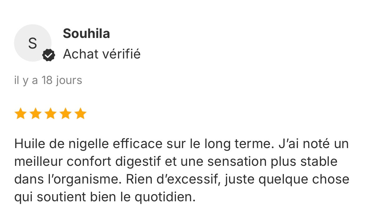 L’huile de nigelle soutient l’équilibre général et renforce naturellement les défenses de l’organisme.